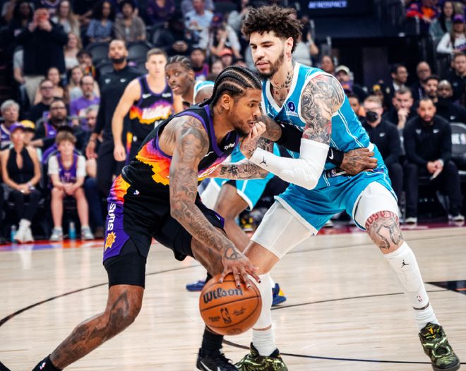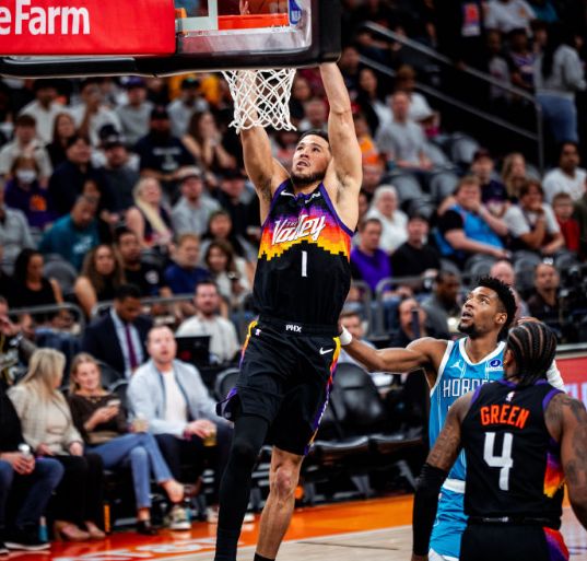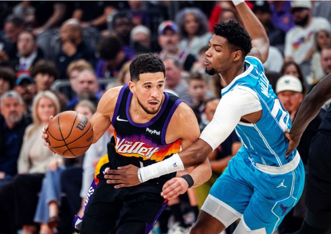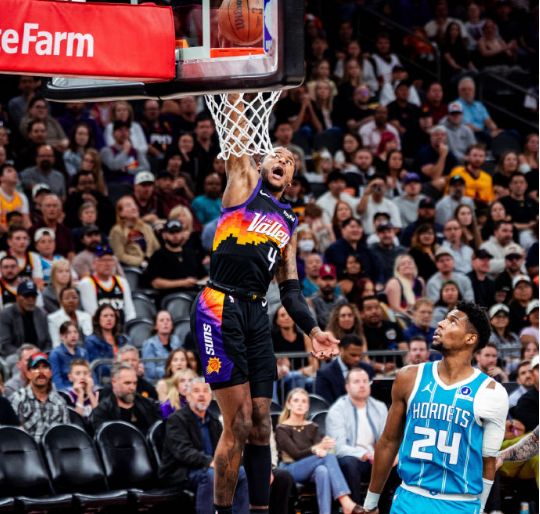 中场休息回来,双方进攻火力均是有所下滑,黄蜂更是本场首次单节不足20分。太阳率先一波8-0攻势扩大10分优势,黄蜂连追5分,布克与吉莱斯皮接连得分,太阳重新扩大76-67领先优势。黄蜂一波8-0攻势追到差1分,太阳重新取得微弱优势,太阳单节21-19净胜2分,三节结束太阳81-77领先黄蜂。前三节比赛,黄蜂三分35中12,三球17+7+5与克努佩尔15分,引领4人得分上双;太阳三分30中11,格林22分、布克23+7与吉莱斯皮15分。