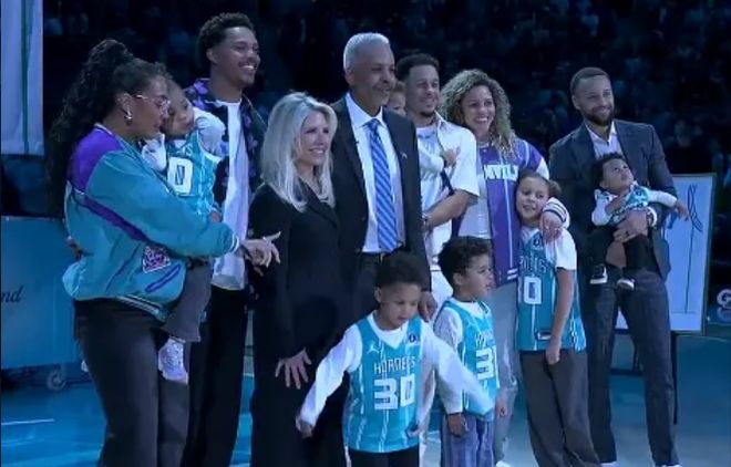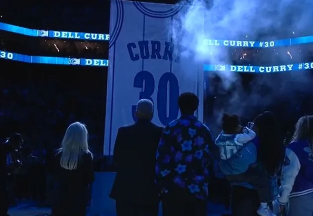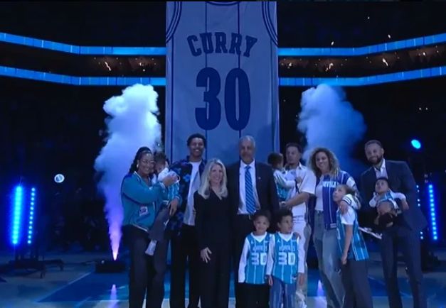 如今黄蜂主场为戴尔-库里举办30号球衣退役仪式,库里全家人到场见证父亲的荣耀时刻,见证30号球衣冉冉升空,并且全家一起合影留念。