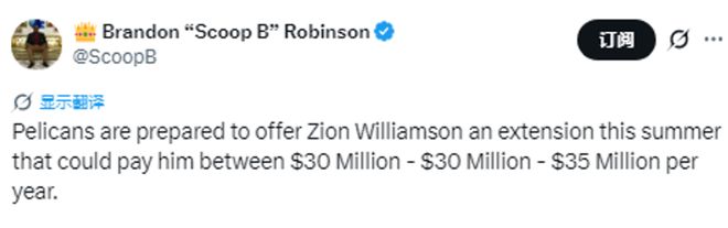 北京时间4月10日,据NBA记者布兰登-罗宾逊报道,鹈鹕消息源透露,球队对锡安-威廉姆森的支持毫无动摇。球队计划在今夏为他提供一份2-3年续约合同,年薪在3000万至3500万美元之间。尽管锡安2022年签下的5年续约仍在中段,但这份新合同意在巩固他的球队基石地位。