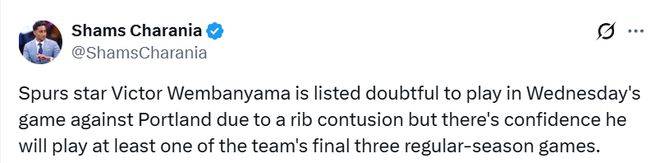北京时间4月8日,据名记Shams报道,马刺方面并不认为文班亚马遭遇严重伤病。文班亚马昨晚对肋骨部位拍了X光,结果显示无结构性损伤。Haynes随后报道,文班核磁结果也没问题,避免严重伤病,状态是每日观察。文班明日对开拓者他被列为小概率出战,但外界预计他最后三场至少打一场。