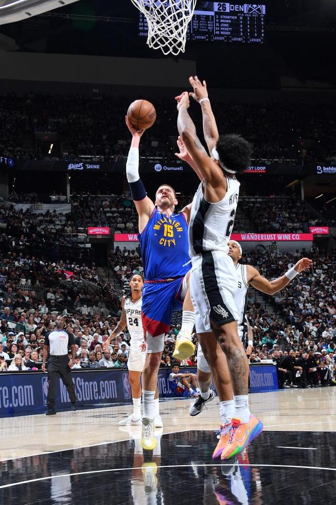 本赛季前三次交锋掘金2胜1负处于上风,本场掘金缺少穆雷、戈登、布劳恩、卡约等7位主力,约基奇复出,马刺缺少文班亚马与科内特。首节前2分半钟,双方维持9-9,马刺逐步取得3分领先优势,掘金打出一波小高潮以24-18反超6分。掘金之后以35-30领先,马刺连得4分,约基奇两罚全中,首节结束掘金37-34领先马刺。首节掘金26中10,其中三分11中4,约基奇12+7与斯特劳瑟3记三分14分;马刺27中13,其中三分8中3,卡斯尔4中0得到2分4助攻。