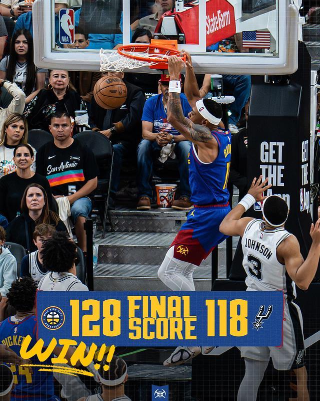 北京时间4月13日,NBA常规赛掘金客场对阵马刺,掘金轮休除约基奇外的7位主力,马刺轮休文班亚马。约基奇仅打两节达成65场指标后下半场未出场,掘金一度打出22-0攻势取得23分领先优势,马刺顽强反扑末节开局追到仅差6分。掘金随后重新扩大15+领先优势,最终掘金128-118战胜马刺豪取12连胜,继续刷新约基奇时代最长连胜纪录,掘金锁定西部第三将在季后赛首轮对阵森林狼。